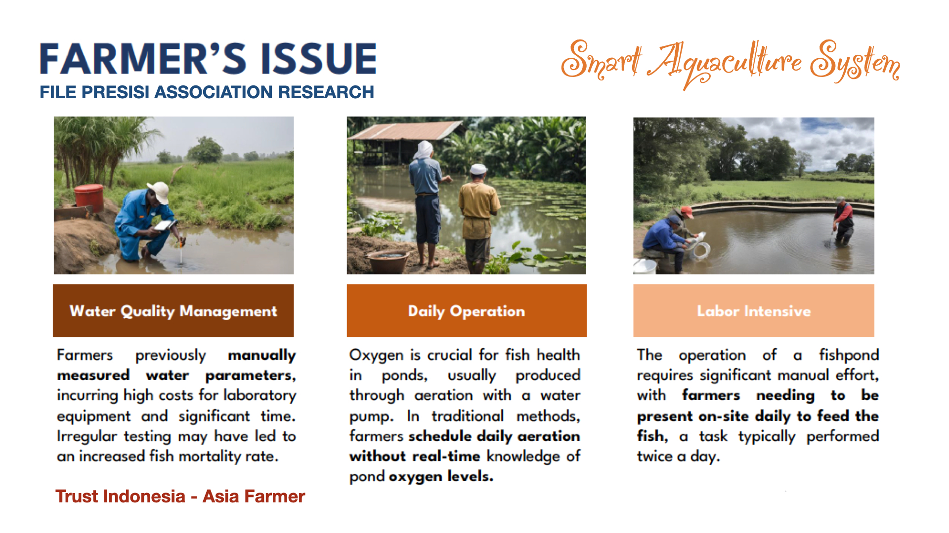 Di Pulau Seram, Maluku, Kelompok Tani Sumber Rejeki berhasil meningkatkan pendapatan 50% setelah mengadopsi sistem monitoring digital. “Kami mulai dengan satu sensor untuk lima kolam, bergantian pakai. Hasilnya meyakinkan, sekarang setiap kolam punya sensor sendiri,” cerita ketua kelompoknya. Sementara di Brebes, Jawa Tengah, koperasi perikanan setempat berhasil mengekspor udang vaname ke Jepang setelah menerapkan sistem traceability digital. “Buyer Jepang percaya karena bisa lacak kondisi budidaya lewat QR code,” ujar Manajer Koperasi.